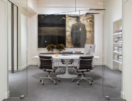 For the last twenty years we have occupied four spaces, including Jackson Square, the Design District, Showplace Design Center and now the Galleria Design Center. With each move we have been able to adapt and refine our original idea - a serene achromatic space with elegant detailing and finishes, built around white and aluminum Knoll furnishings. Along the way we have made minor adjustments to the furnishings, incorporated numerous custom elements, and we have increased the size of our art collection. Our newest offices are completely redesigned from the previous tenant. We have rearranged the windows and doors and created a large open studio space, which borrows daylight from our across-the-hall neighbors. We now enjoy the luxury of a large reception room, a separated design studio and a semi-private office with adjoining conference/workroom for the principal. One of our favorite new pieces is a lighted mobile pendant by noted New York artist David Weeks.
