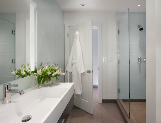 Upstairs, the bathroom has a much more organic feel, using a shaved pebble floor, linen textured vinyl wall covering, and a watery green wall tile. Here the vanity is veneered in a rich walnut. The residence, nestled on 20 acres of heavily wooded land, has been meticulously detailed throughout, with new millwork, hardware, and finishes. (2012-2013)
